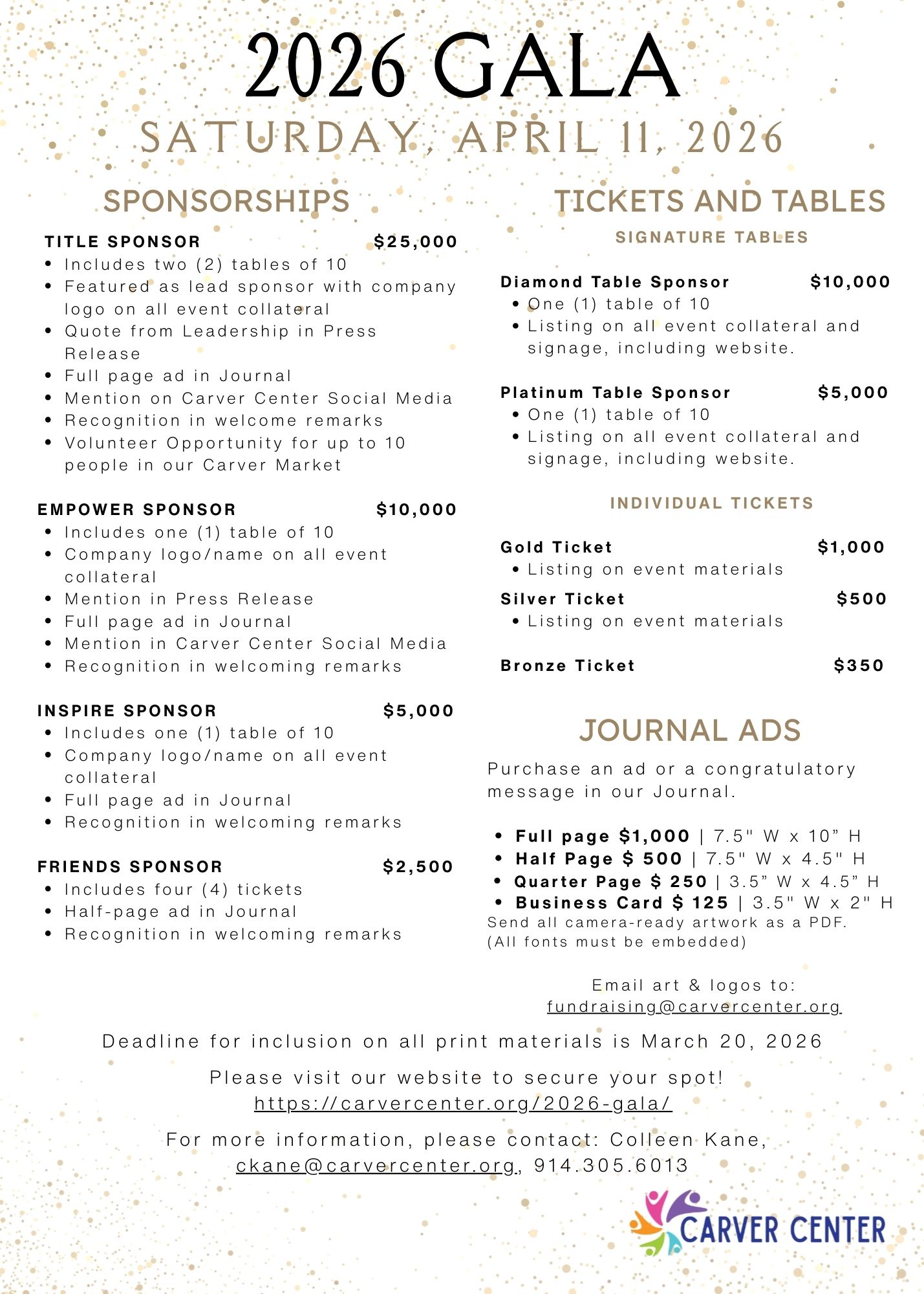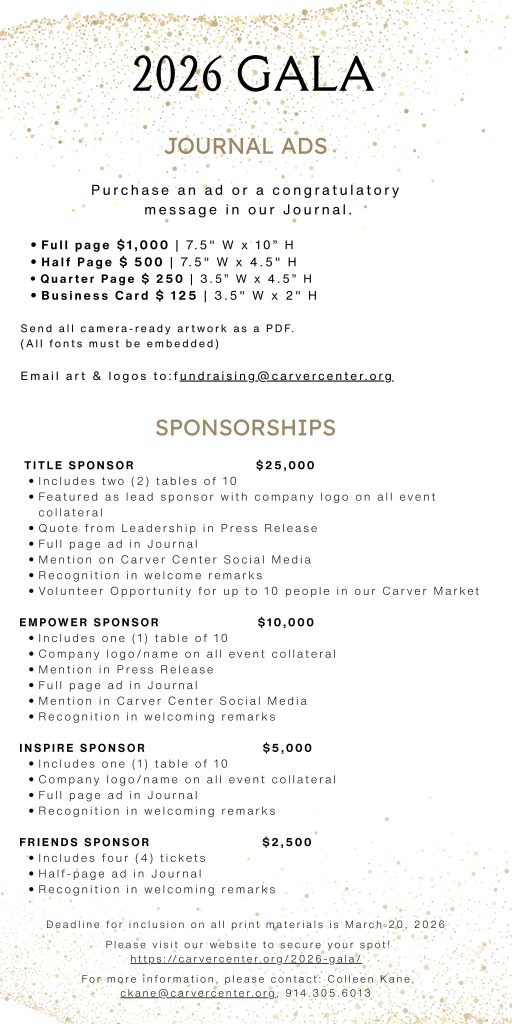 2026 Carver Center Gala Journal AD Opportunities Full listing of sponsorship opportunities can be found here: 2026 Sponsorship Opportunities Please contact Colleen Kane at ckane@carvercenter.org or 914-305-6013 for more information